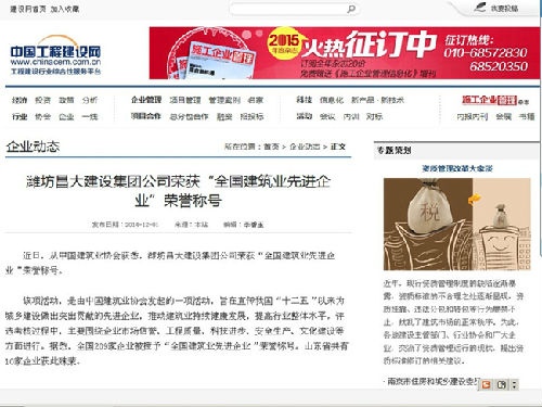 濰坊昌大建設集團榮獲“全國建筑業(yè)先進企業(yè)”榮譽稱號——中國工程建設網(wǎng)“企業(yè)動態(tài)”2