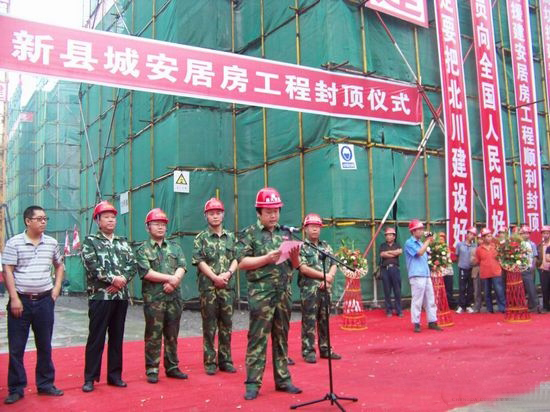 9月25日上午11時(shí)20分,山東省援建新北川安居房工程舉行隆重的封頂儀式,儀式地點(diǎn)就設(shè)在集團(tuán)公司承建的工程施工現(xiàn)場(chǎng)。中央電視臺(tái)新聞?lì)l道在中午11時(shí)至12時(shí)的新聞直播段進(jìn)行了現(xiàn)場(chǎng)插播報(bào)道,“昌大建設(shè)”字號(hào)和援川人員多次在畫(huà)面中出現(xiàn)。集團(tuán)公司總經(jīng)理朱九洲參加了今天的封頂儀式并講話。今天封頂儀式現(xiàn)場(chǎng)下著大雨,援川人員在雨中舉行了這一慶奠。 根據(jù)指揮部的消息,第八分公司承擔(dān)的六棟安居房已于昨天(24日)全部封頂。