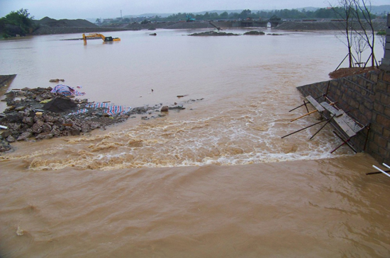 7月24日至25日,一場特大暴雨突襲北川新縣城,集團(tuán)公司援建的多處工地受到影響。至25日凌晨,職工宿舍、辦公室、食堂等地方進(jìn)水高達(dá)40cm,集團(tuán)公司的援川人員,特別是第八分公司的員工及時展開自救。幾個小時內(nèi),大家先后將室內(nèi)的物品轉(zhuǎn)移到高處沒有進(jìn)水的房間,天一亮,指揮部便緊急組織工地?fù)岆U,大家分工協(xié)同,分別趕赴安昌河下游施工段和安昌河已驗(yàn)收河段查看受災(zāi)情況……由于指揮部早在20日就下達(dá)安昌河防防汛通知,各施工單位提前應(yīng)對,從而保證在這次特大洪水來臨時,所有施工人員安全撤離、所有材料轉(zhuǎn)移(由于汛情超過預(yù)想,第八分公司安昌河下游施工段景觀濕地形成了大面積積水致使一些土方機(jī)械過水)。此次洪水來襲,已竣工的安昌河段安然無恙,第八分公司正在施工的安昌河下游溢流堰、擋水堰已經(jīng)合攏,經(jīng)受住了洪水沖擊。 ![]() 洪水中的施工現(xiàn)場