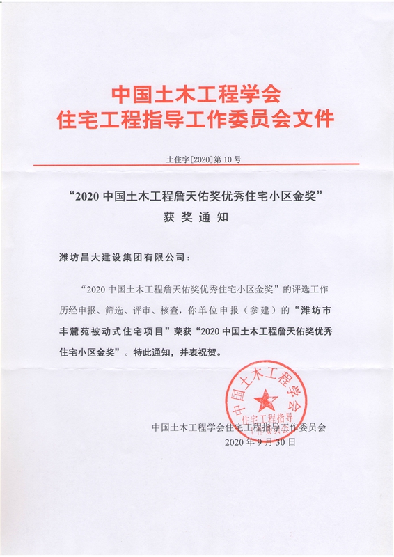 2020年10月12日上午,集團(tuán)收悉中國土木工程學(xué)會文件“2020中國土木工程詹天佑獎優(yōu)秀住宅小區(qū)金獎獲獎通知”:歷經(jīng)申報、篩選、評審、核查,集團(tuán)申報的由集團(tuán)二建公司總承包施工、二安公司參與施工的濰坊市豐麓苑被動式住宅項目榮獲“2020中國土木工程詹天佑獎優(yōu)秀住宅小區(qū)金獎”。 據(jù)悉,這是濰坊歷史上首次獲得這一獎項。恭喜集團(tuán),恭喜集團(tuán)全體員工,并向濰坊全體建筑業(yè)者分享這一榮譽(yù)。 附: 申報時間:2020年4月30日; 公示時間:2020年9月23日至30日; 獲獎時間:2020年9月30日。 ![]() |
