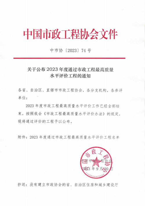 集團(tuán)榮獲2023年度市政工程最高質(zhì)量水平評價(jià)工程獎