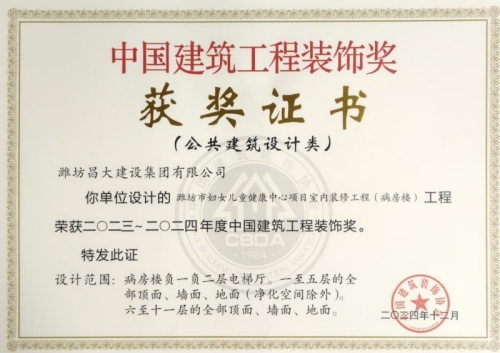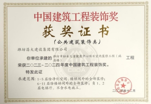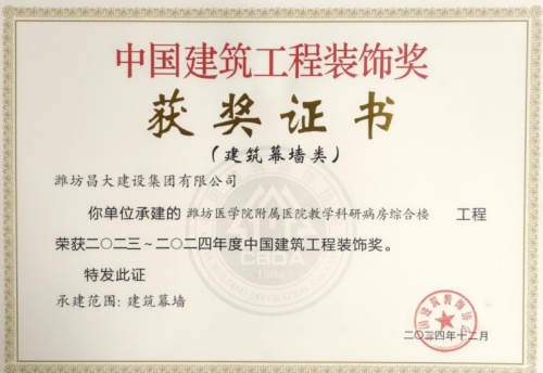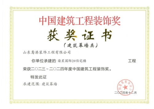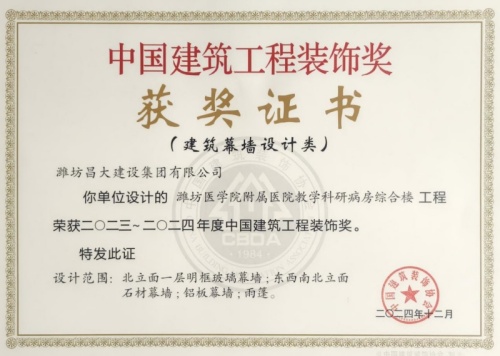 2024年12月10日,中國(guó)建筑裝飾協(xié)會(huì)在北京召開(kāi)大會(huì),表彰2023~2024年度“中國(guó)建筑工程裝飾獎(jiǎng)”工程。集團(tuán)裝飾幕墻工程公司、山東鳶港裝飾工程有限公司的三項(xiàng)工程榮獲五個(gè)獎(jiǎng)項(xiàng):濰坊醫(yī)學(xué)院附屬醫(yī)院教學(xué)科研病房綜合樓(建筑幕墻類和幕墻設(shè)計(jì)類)、濰坊市婦女兒童健康中心病房樓(公共建筑裝飾類和公共建筑裝飾設(shè)計(jì)類),柒星國(guó)際2#住宅樓(建筑幕墻類)。