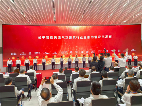 會議播放了建筑行業(yè)發(fā)展成果視頻《基石之力筑夢中國式現(xiàn)代化》;中國建筑董事長、黨組書記鄭學(xué)選進(jìn)行了主旨發(fā)言;倡議發(fā)起單位代表中鐵二局黨委副書記、總經(jīng)理張兵,中核集團(tuán)副總工程師、中國核建黨委書記、董事長陳寶珠,上海建工集團(tuán)黨委副書記、工會主席殷紅霞,濰坊昌大建設(shè)集團(tuán)董事長徐鵬強分別進(jìn)行了表態(tài)發(fā)言;中建一局黨委書記、董事長左強代表建筑企業(yè)宣讀了倡議書,中建二局、中國核建、中機(jī)建設(shè)、中國中冶、通用技術(shù)集團(tuán)新興公司、中國化學(xué)國際公司、中鐵電氣化局、中鐵建設(shè)、中交一公局集團(tuán)、中國電建水電七局、中國能建浙江火電、中國安能一局、北京城建、隧道股份、廣東建工控股、山東科達(dá)集團(tuán)、濰坊昌大建設(shè)集團(tuán)、興泰建設(shè)集團(tuán)領(lǐng)導(dǎo),共同按壓大屏手印圖案,聯(lián)合發(fā)布了《關(guān)于號召建筑行業(yè)黨組織和廣大黨員在營造風(fēng)清氣正行業(yè)環(huán)境中走在前作表率的倡議書》。